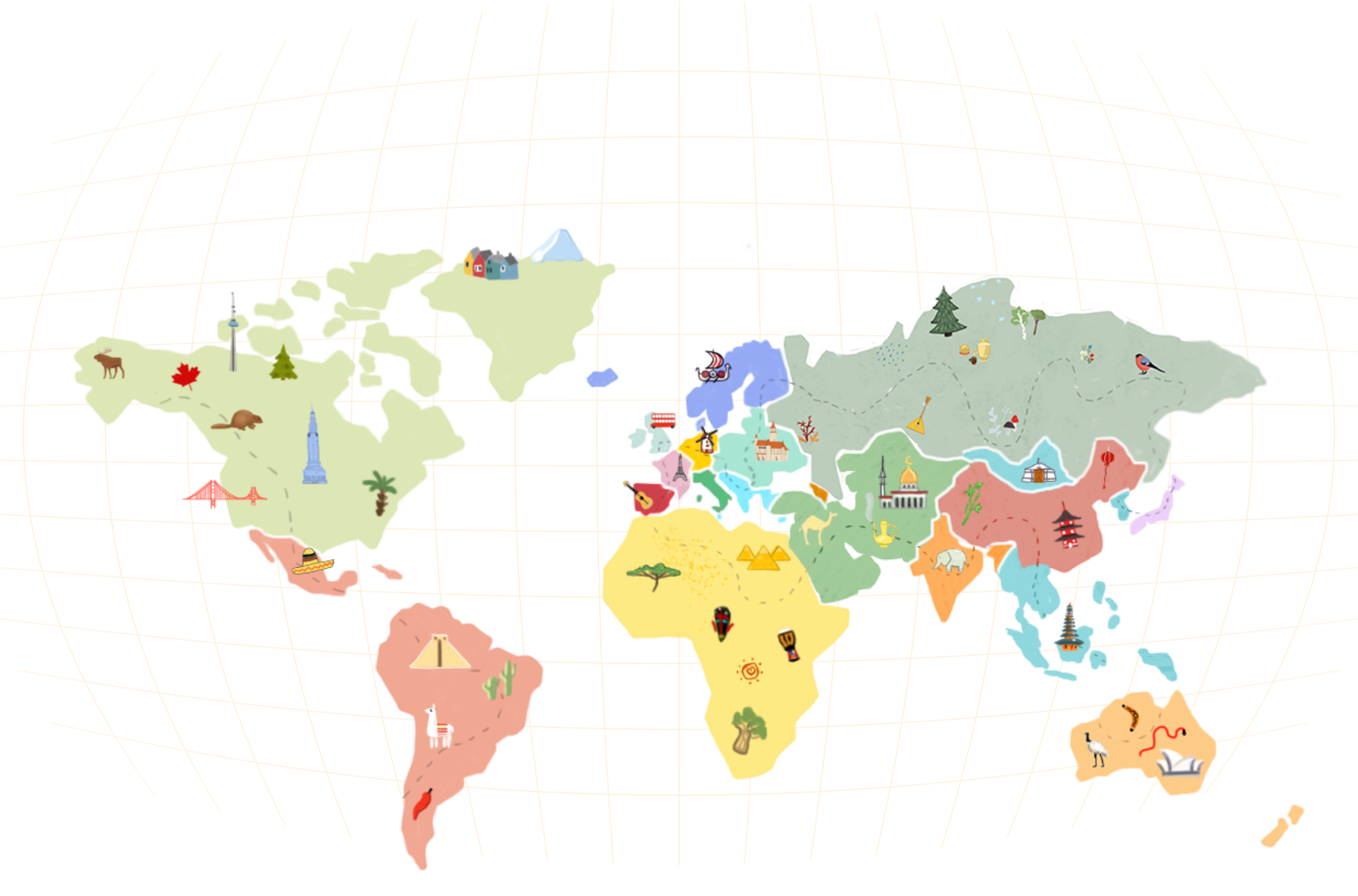 Карта Фантазеландии напоминает карту реального мира и насчитывает 19 областей — где-то это отдельная страна, где-то группа стран, где-то целый континент, и объединены они особенностями культуры.